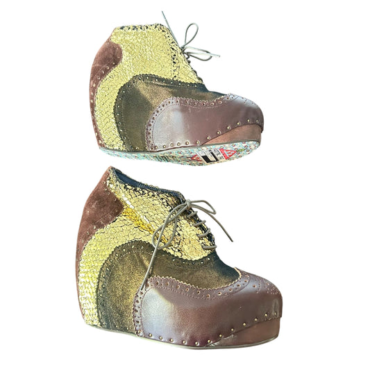 Boots Ankle Heels By Irregular Choices In Brown & Gold, Size: 11