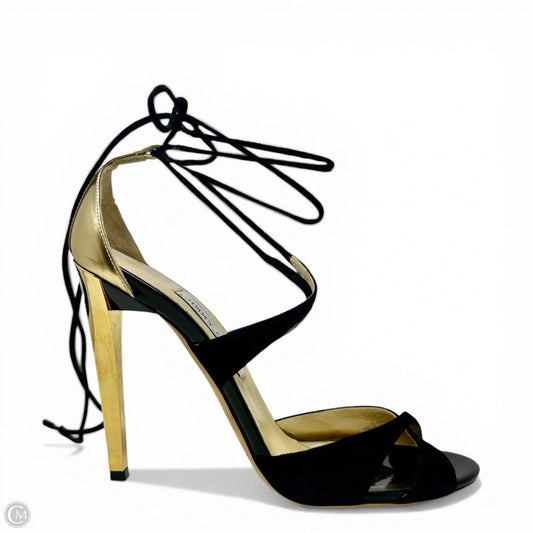 Teira Stiletto Lace Up Sandals Luxury Designer By Jimmy Choo In Black & Gold, Size: 9.5