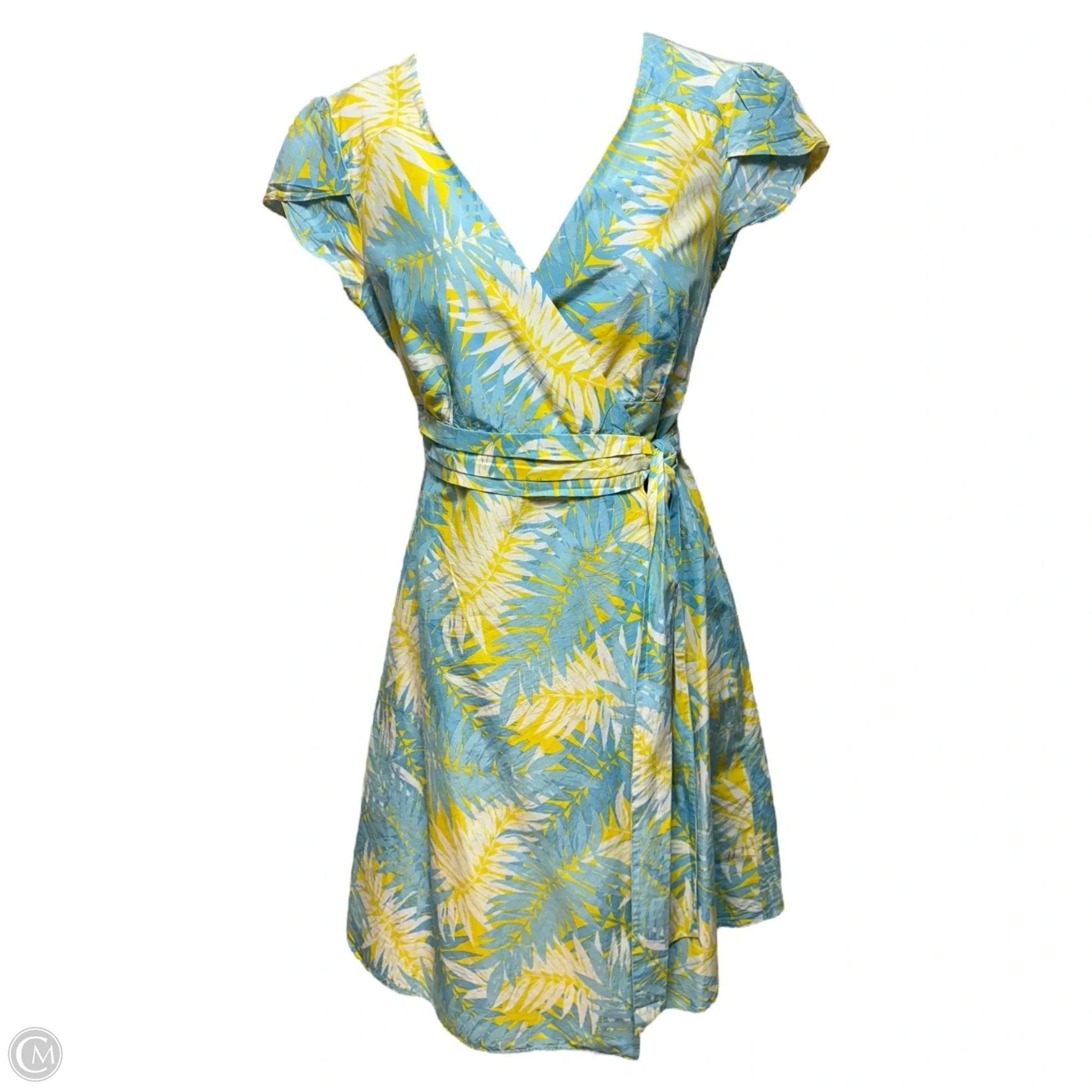 Vintage Wrap Dress Designer By Lilly Pulitzer In Blue & Yellow Tropical Print, Size: 4