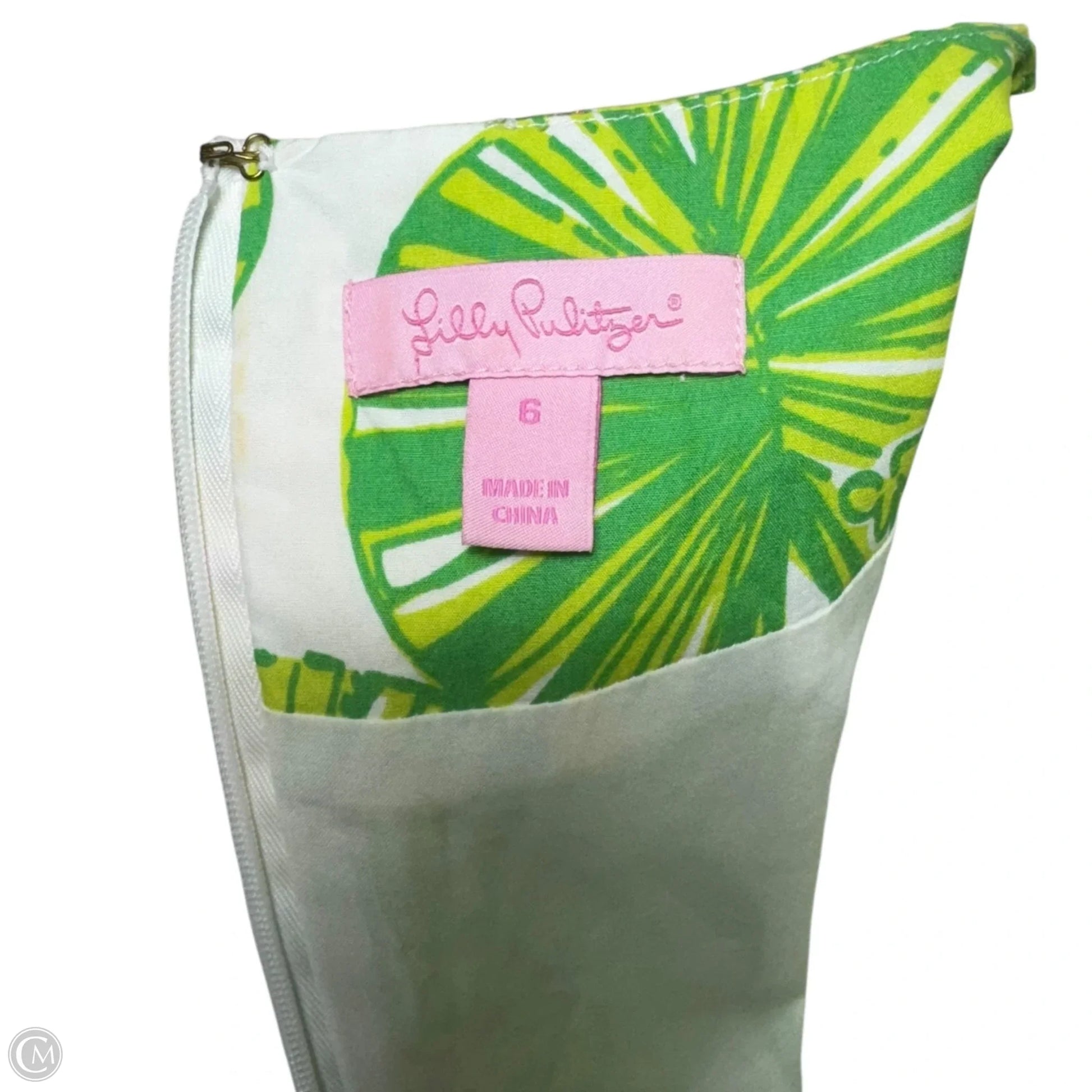 The Lilly Pulitzer dress in green and yellow, size 6, exudes vibrant charm with its unique design and flattering fit.