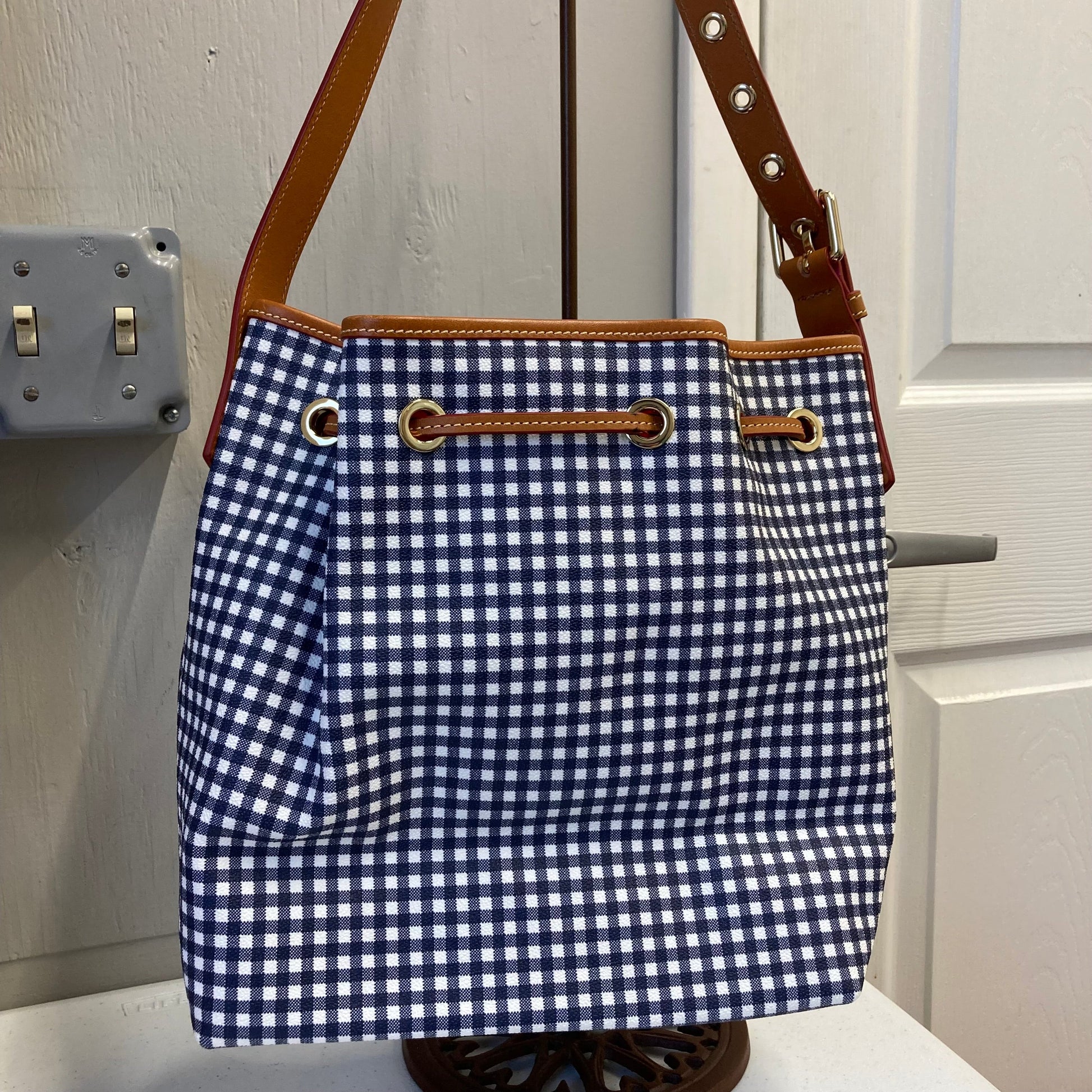 Indulge in the chic allure of a Checkered Designer Handbag by Dooney and Bourke, size: Large.