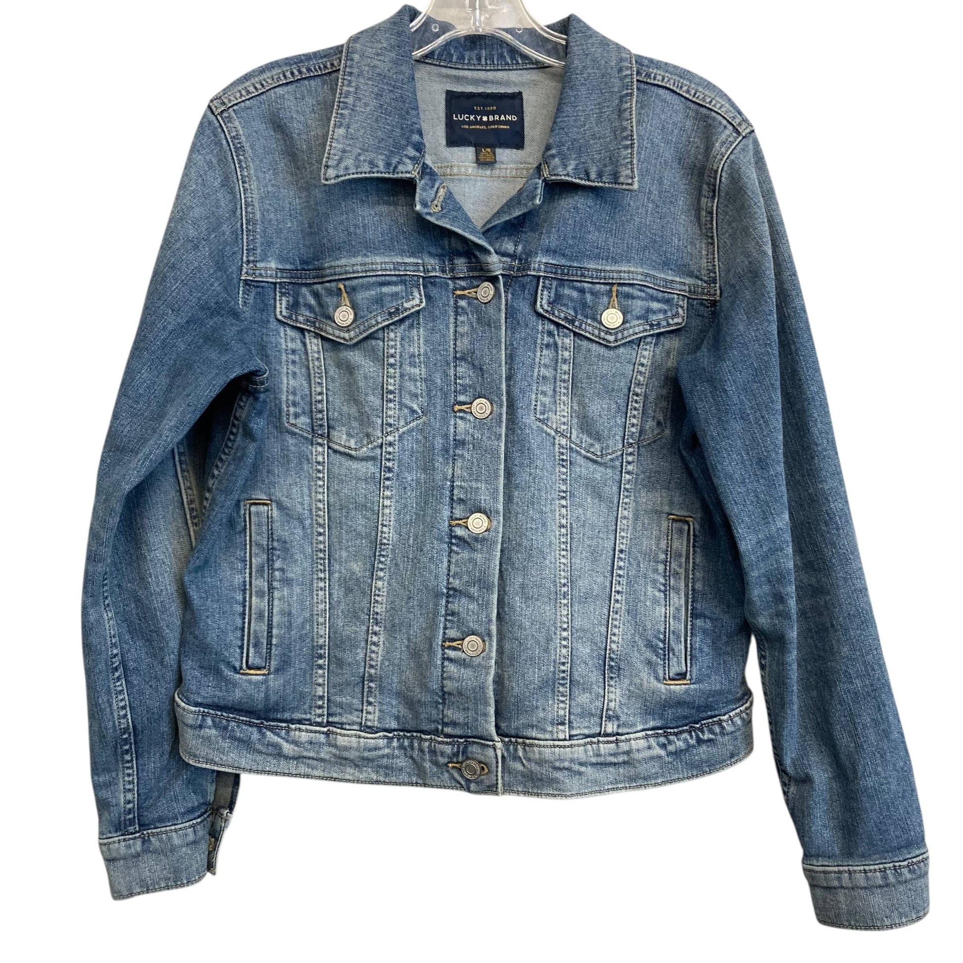 Slip into effortless cool with this Lucky Brand denim jacket in a classic blue hue. Size L for a relaxed fit. Elevate your everyday look effortlessly.