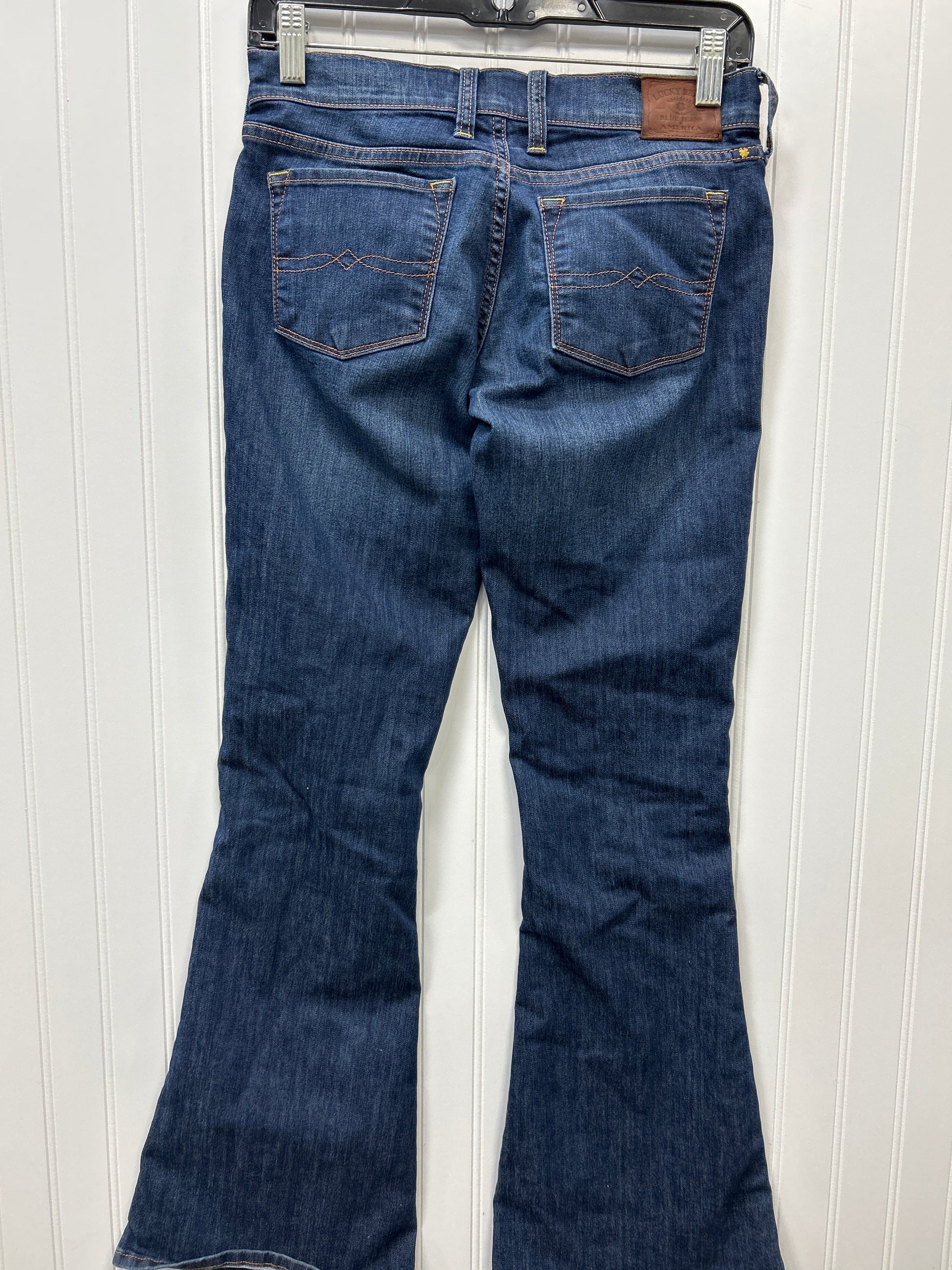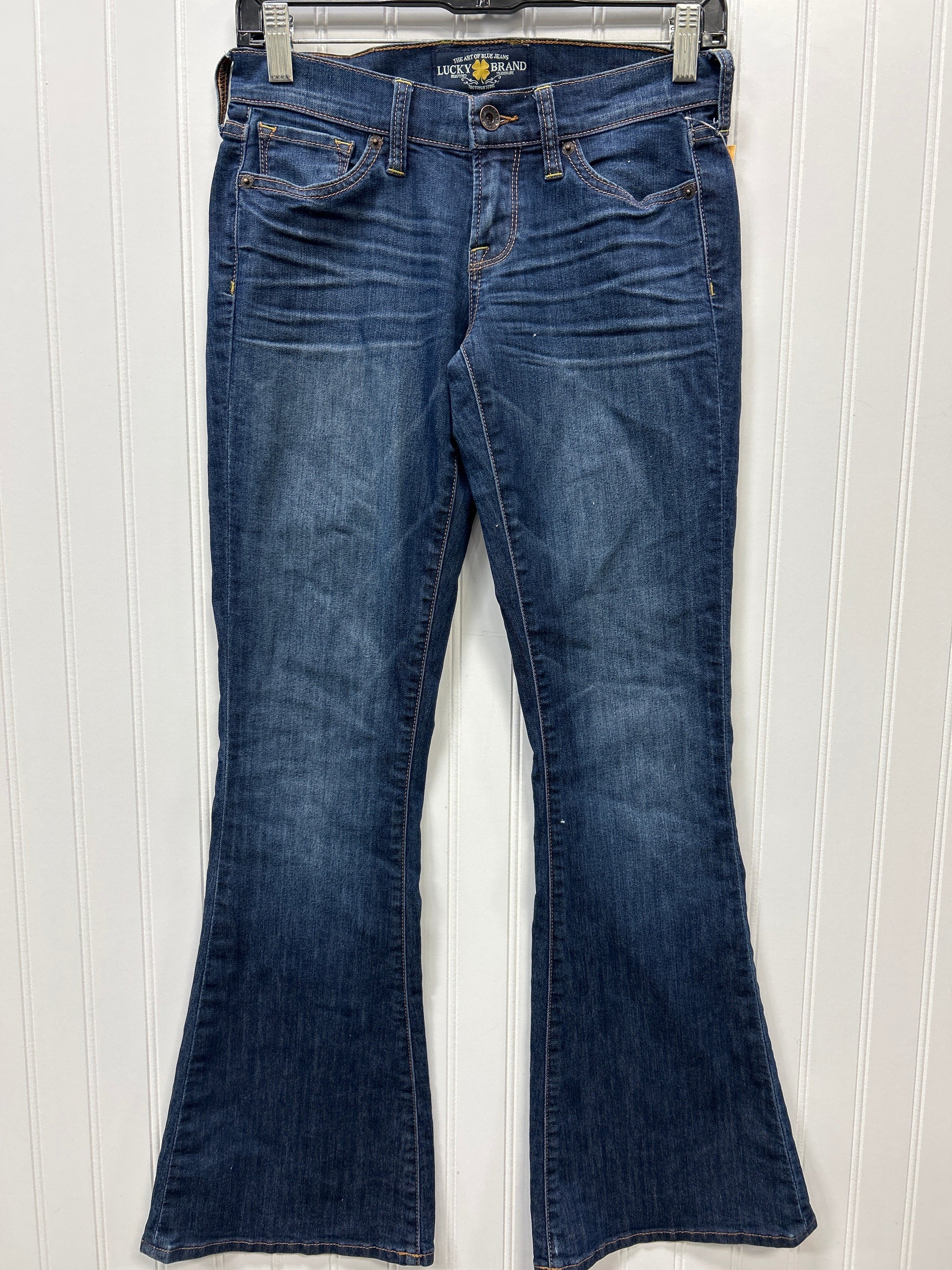 Lucky Brand flared jeans in classic blue denim, size 0. Effortlessly chic with a flattering fit.