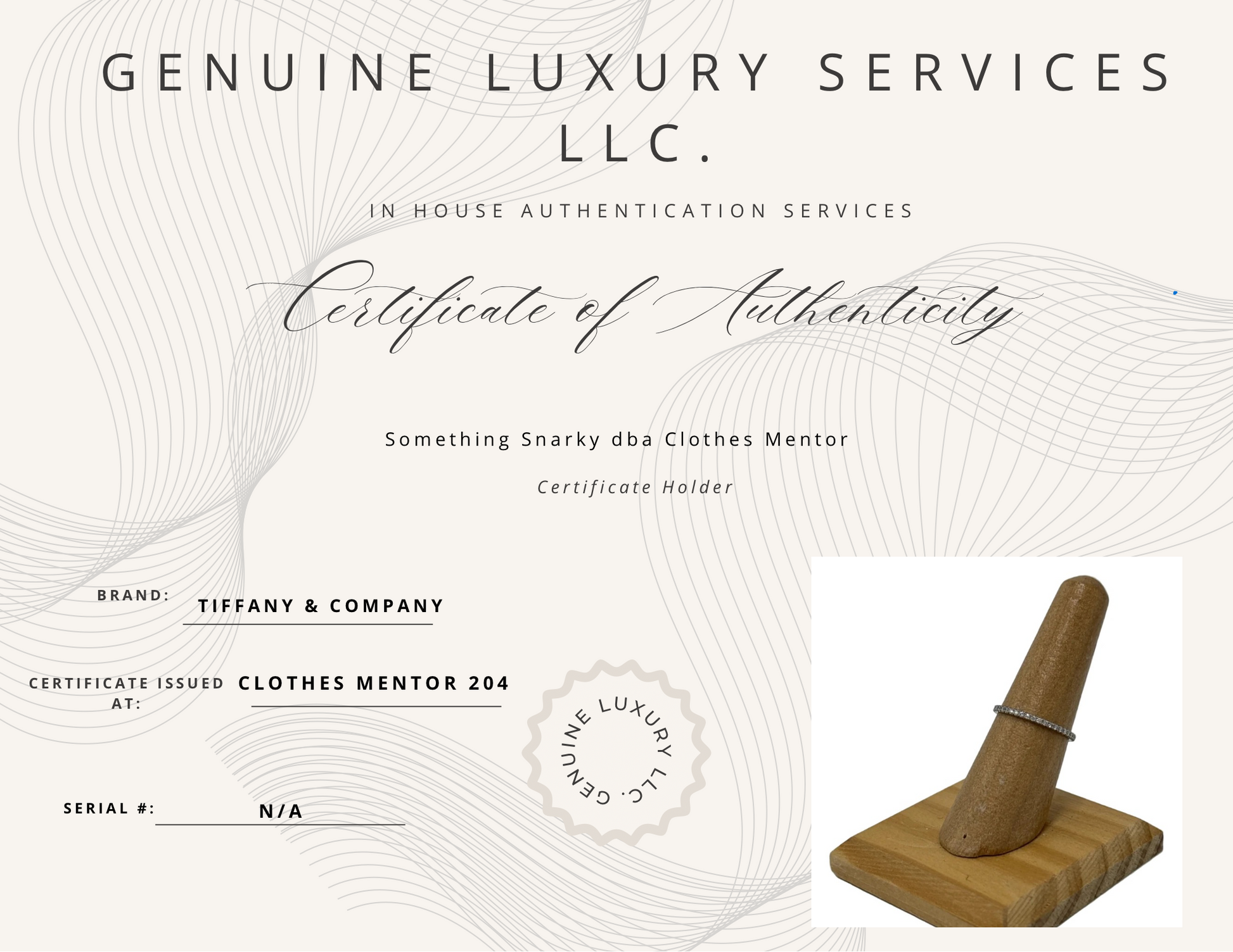 Other Info: T & CO. METRO ETERNITY BAND IN PLATINUM W/DIAMONDS, $2840. CERTIFIED 3RD PARTY AUTHENTIC.