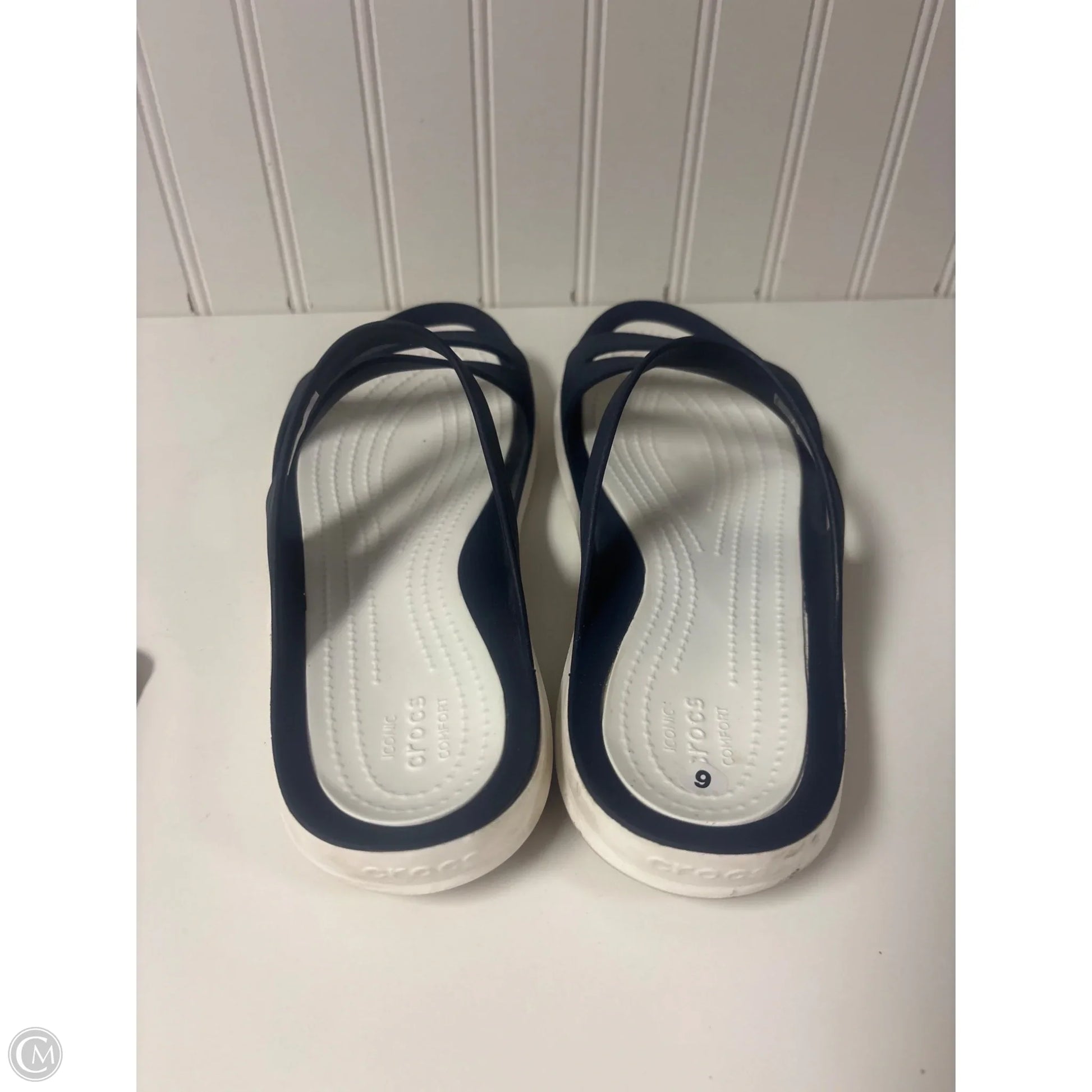 Sandals Flats By Crocs In Blue & White, Size: 9