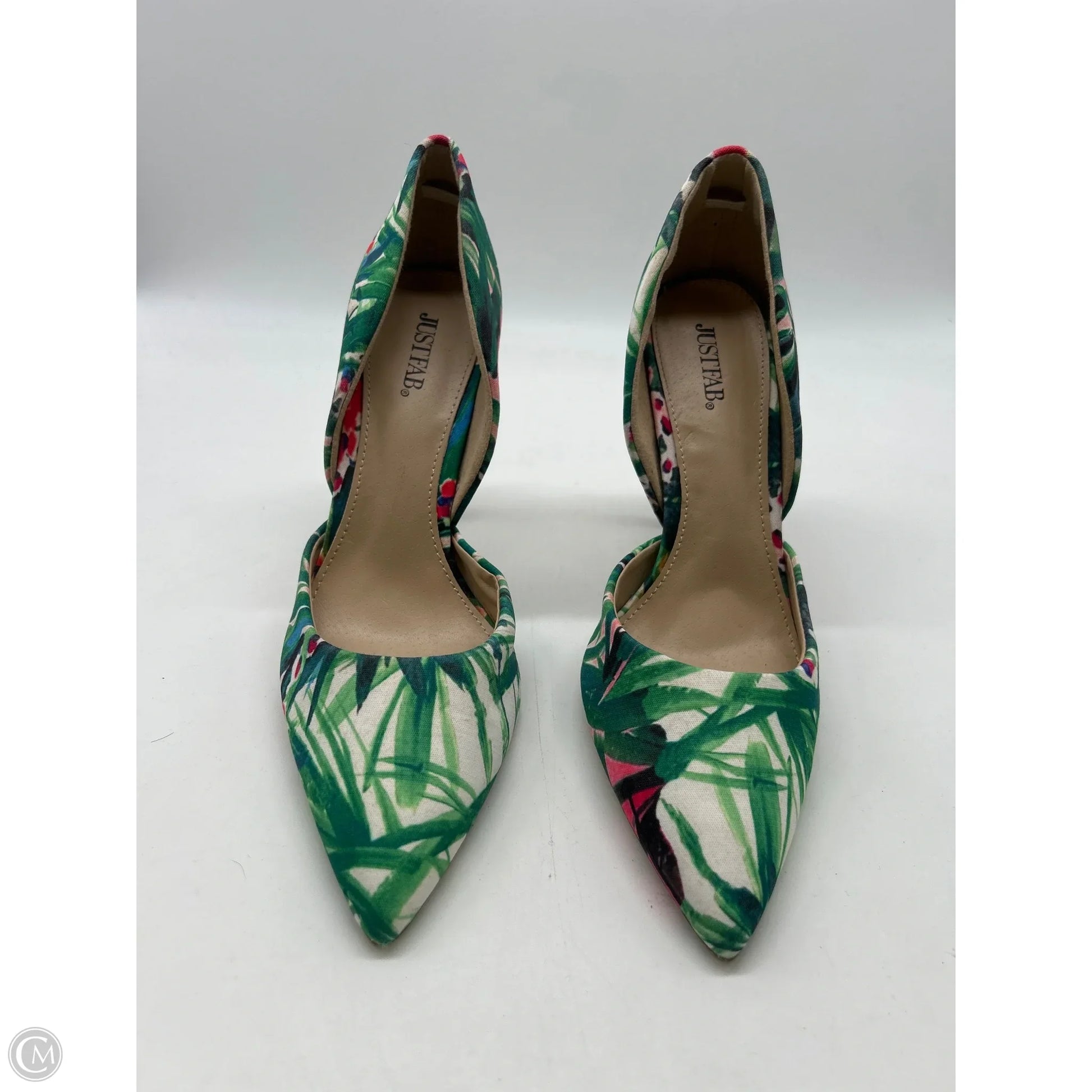 Step into the tropics with these Just Fab stiletto heels! Size 8, featuring a vibrant tropical print for a chic touch. Walk confidently in style and make a statement.