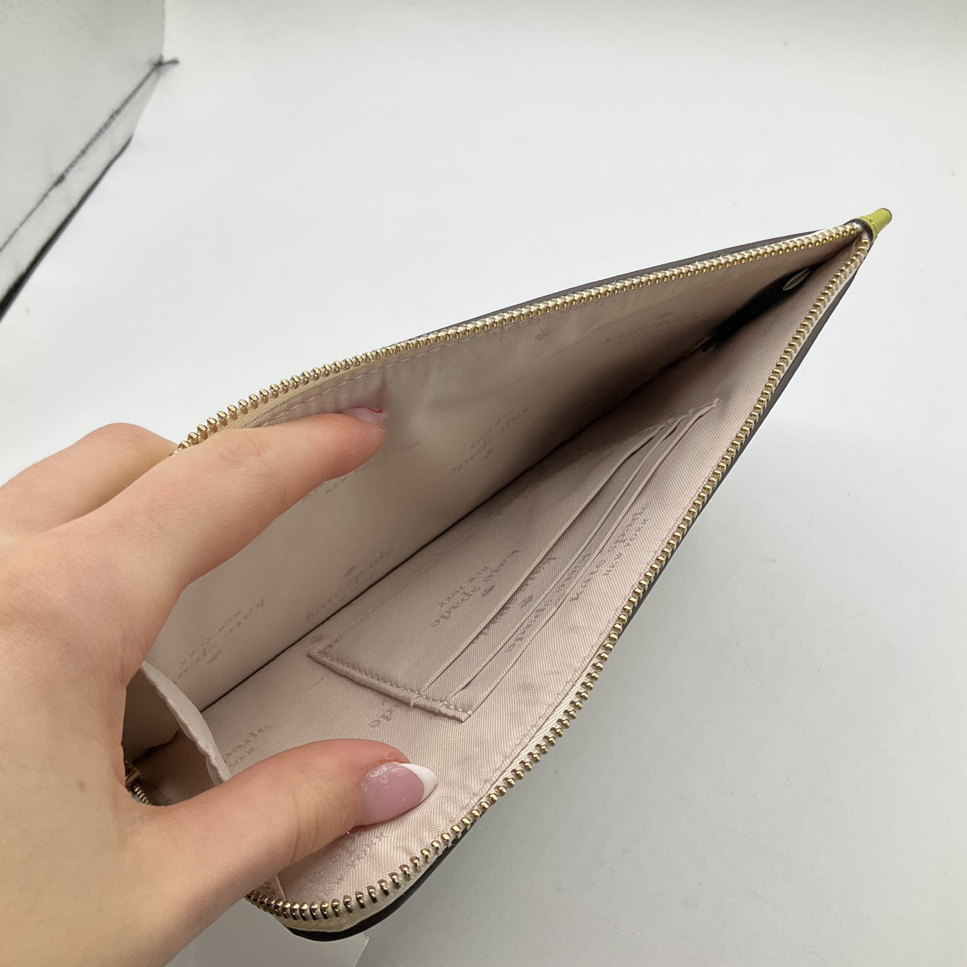 Kate Spade designer wristlet, small size, exudes sophistication and charm with its elegant design and quality craftsmanship.